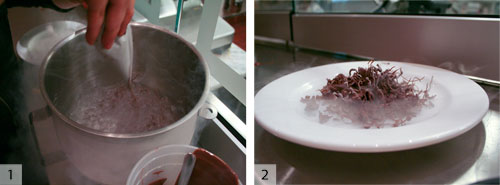 將樹莓分開。1)在液氮中放入一些覆盆子(確保足夠)。2)等待劇烈的沸騰停止-現在漿果一直被冷凍。您可以根據需要減少凍結,但是硬凍結使您的工作時間更長。3)用a面杖搗碎漿果。4)應變。